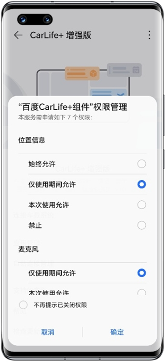 - 确保手机上所有的权限弹框都已点击确定(尤其是百度CarLife+组件弹框)。