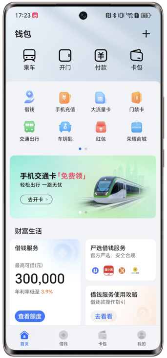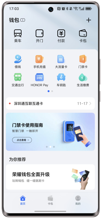 荣耀钱包是荣耀向⽤户提供的统一卡片管理服务,旨在为用户带来便捷的无卡生活新体验。目前提供交通卡、蓝牙/NFC车钥匙、门禁卡、银行卡、校园卡、手机充值等服务。