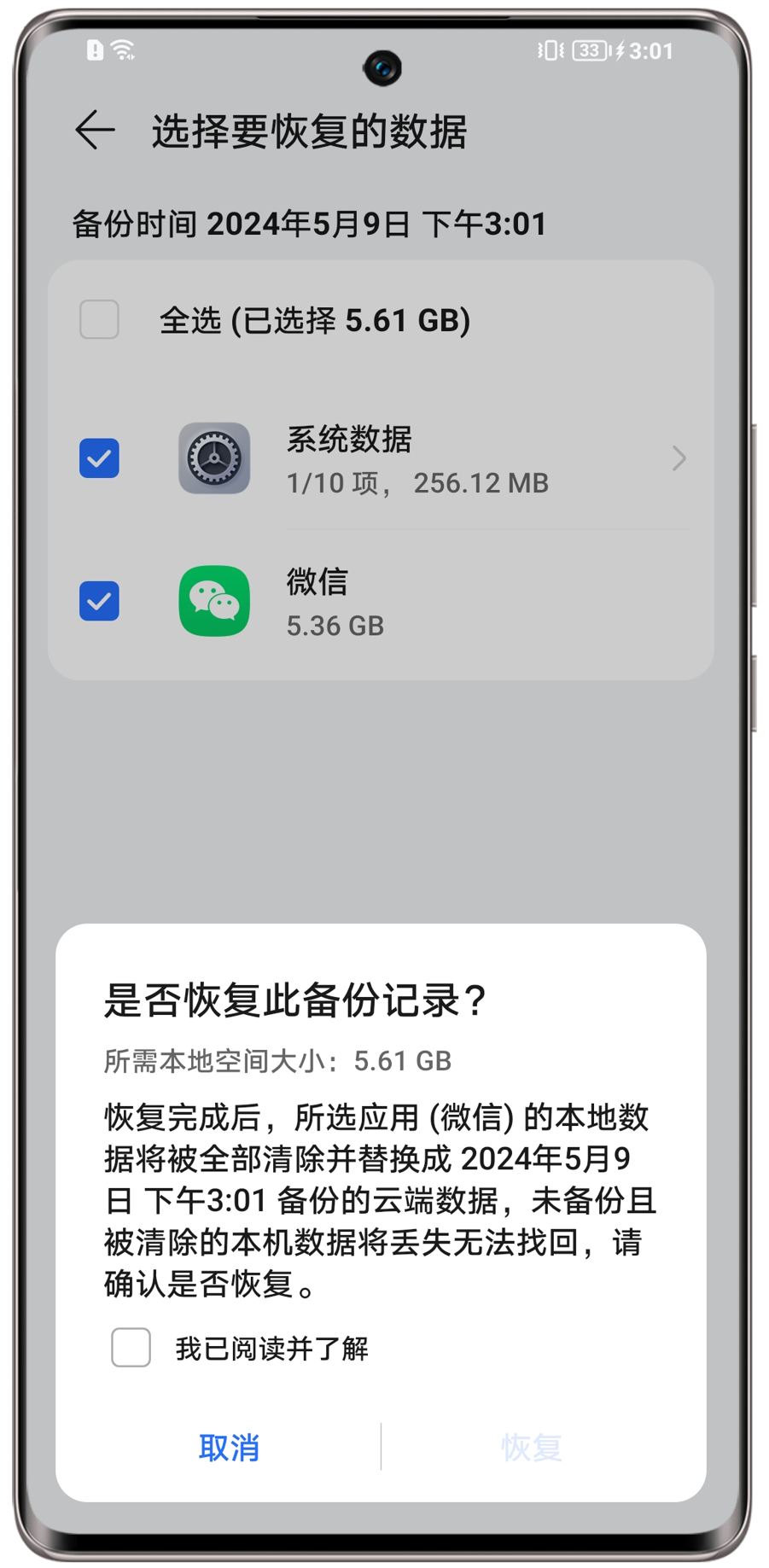 将华为云空间的数据恢复至手机/平板