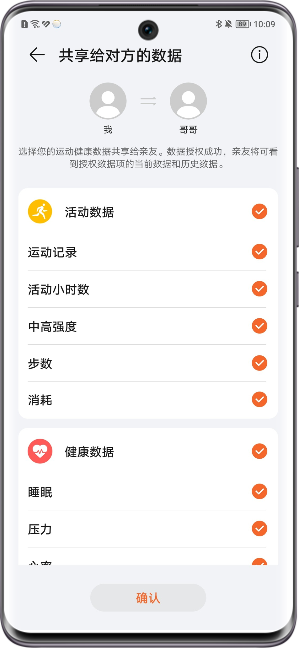 - 确认已添加亲友的共享给对方的数据中是否包含目标数据(需在亲友的设备上操作):荣耀运动健康APP>健康>我的亲友>亲友头像>共享给对方的数据