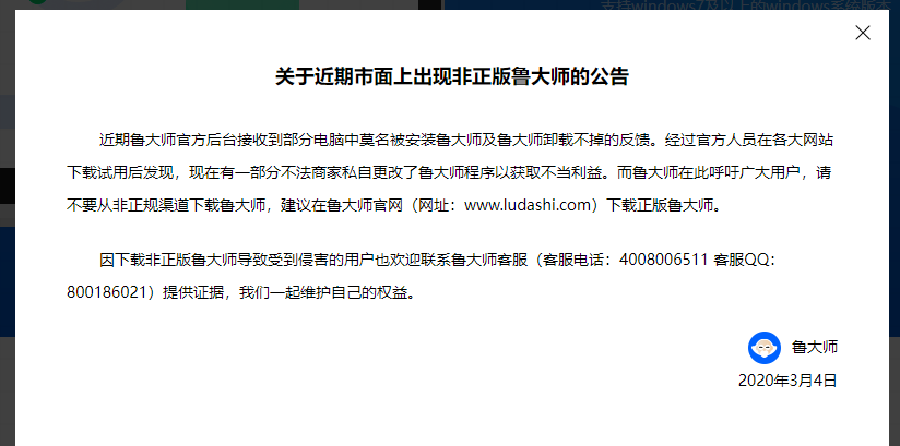 未在鲁大师官网下载安装正版鲁大师导致此问题,请参考鲁大师官网公告,如下图: