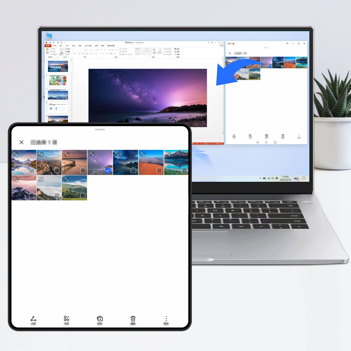 自动发现附近同账号设备,将平板或电脑轻拖至本机,即可建立协同。