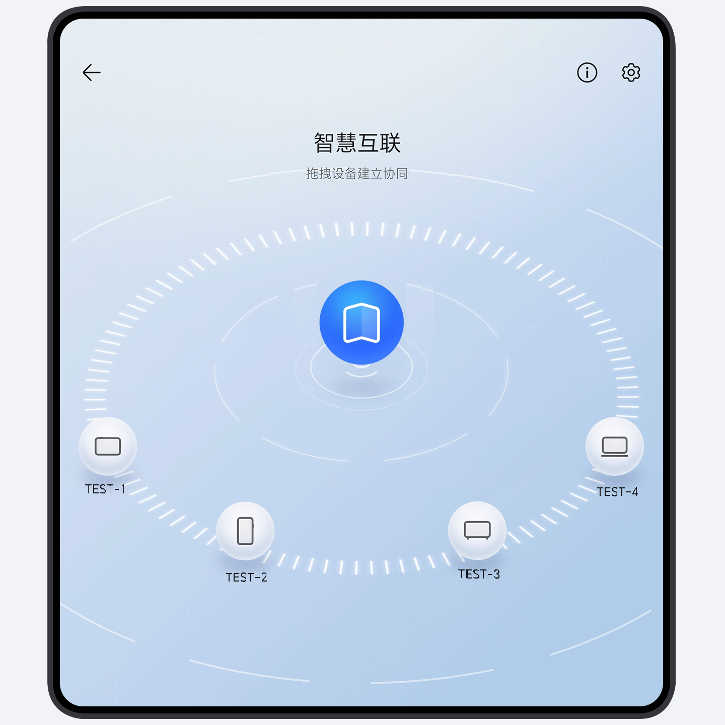 进入智慧互联设备协同页面后,手机会自动发现附近同账号设备并以设备球的形式展现出来,你可以直观的看到设备间的协同状态,还可以拖动设备球建立协同。