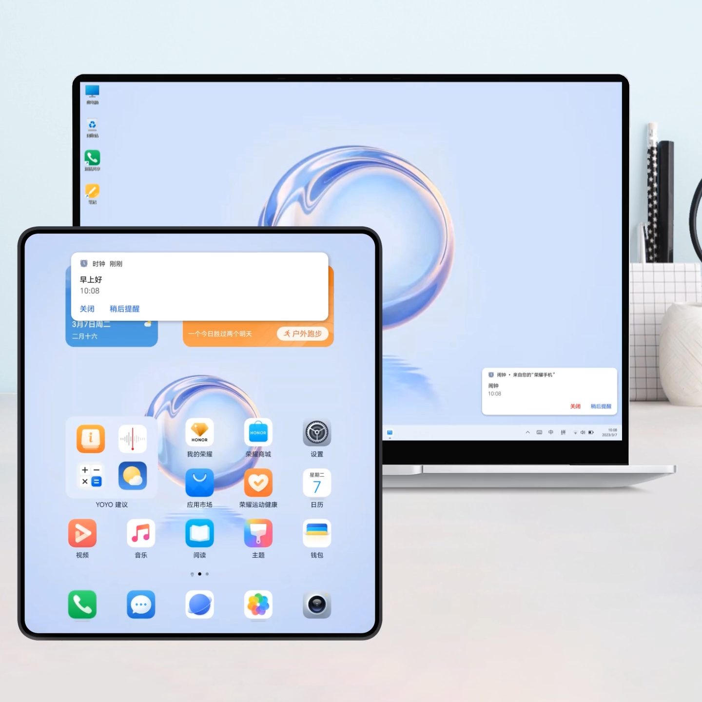 3. 通知共享:在当前使用的平板或电脑等设备上,查看、处理手机通知消息,重要信息不错过、专注不打扰。例如,手机闹钟响起时,可直接在电脑上关闭。