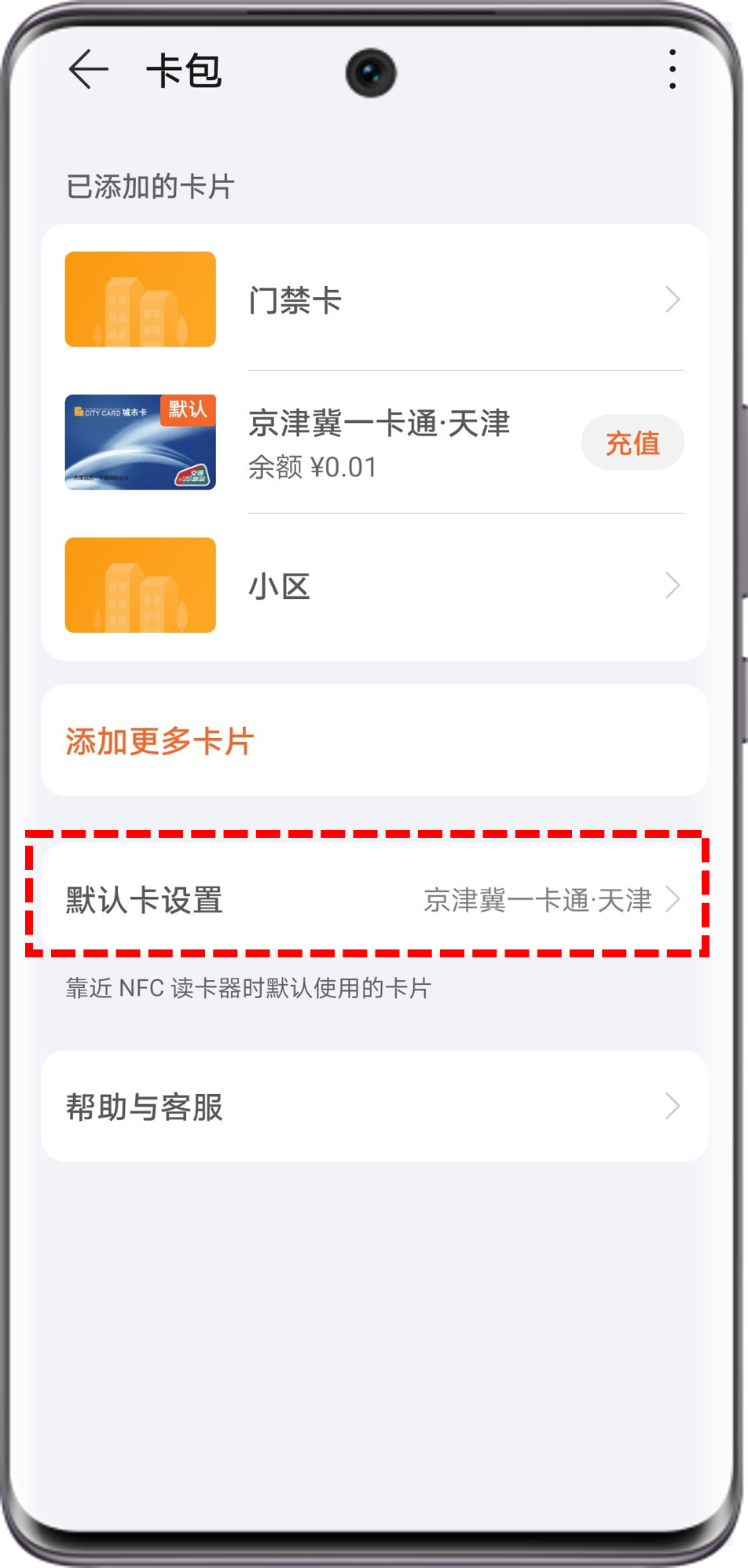 穿戴端:使用荣耀运动健康APP连接手表/手环后,在设备页点击手表/手环卡片进入设备详情页,点击卡包>默认卡设置>点击选择想要默认的卡片。