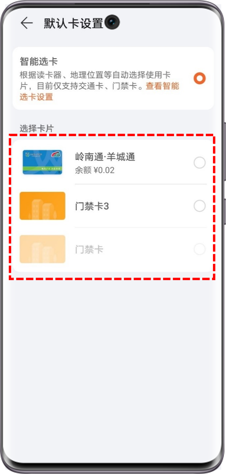 智能选卡功能可以根据读卡器、设备地理位置等自动选择您可能使用卡片,为您智能推荐将要使用的交通卡、门禁卡、NFC车钥匙、校园卡。