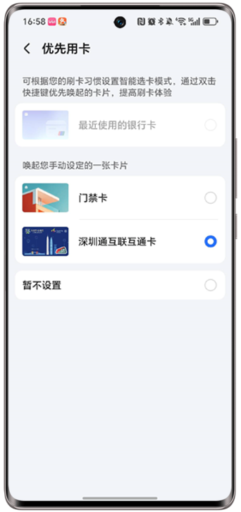 智能选卡模式下,可设置双击电源键优先唤起的卡片,提升刷卡体验。