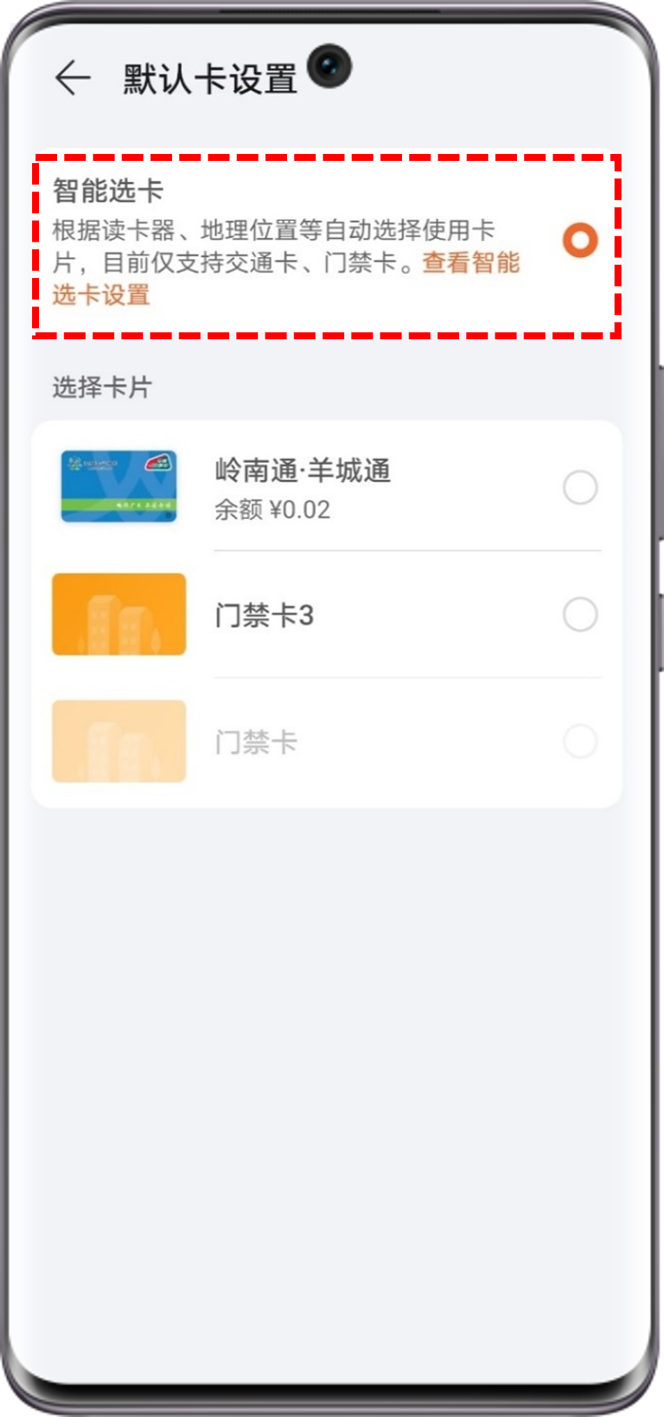 智能选卡功能可以根据读卡器、设备地理位置等自动选择您可能使用卡片,为您智能推荐将要使用的交通卡、门禁卡、NFC车钥匙、校园卡。