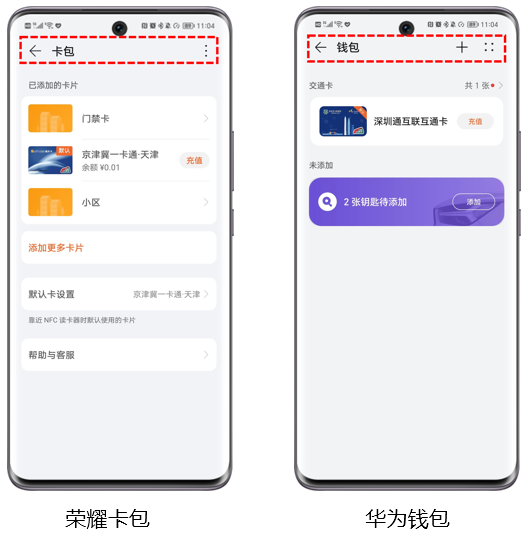 注意确认开通的是荣耀钱包中的门禁卡。穿戴设备中荣耀钱包和华为钱包的页面区别: