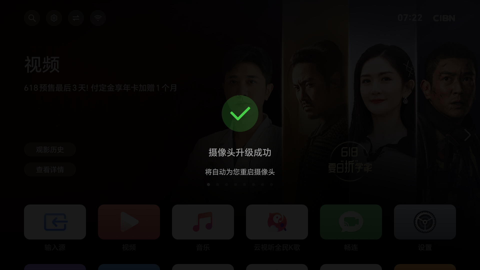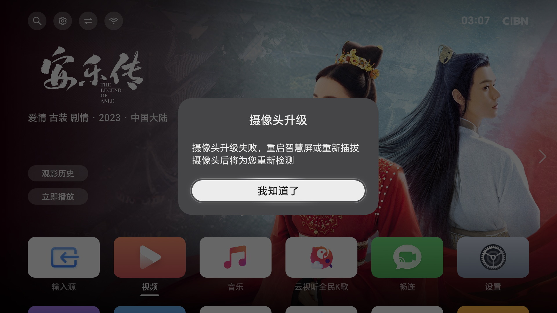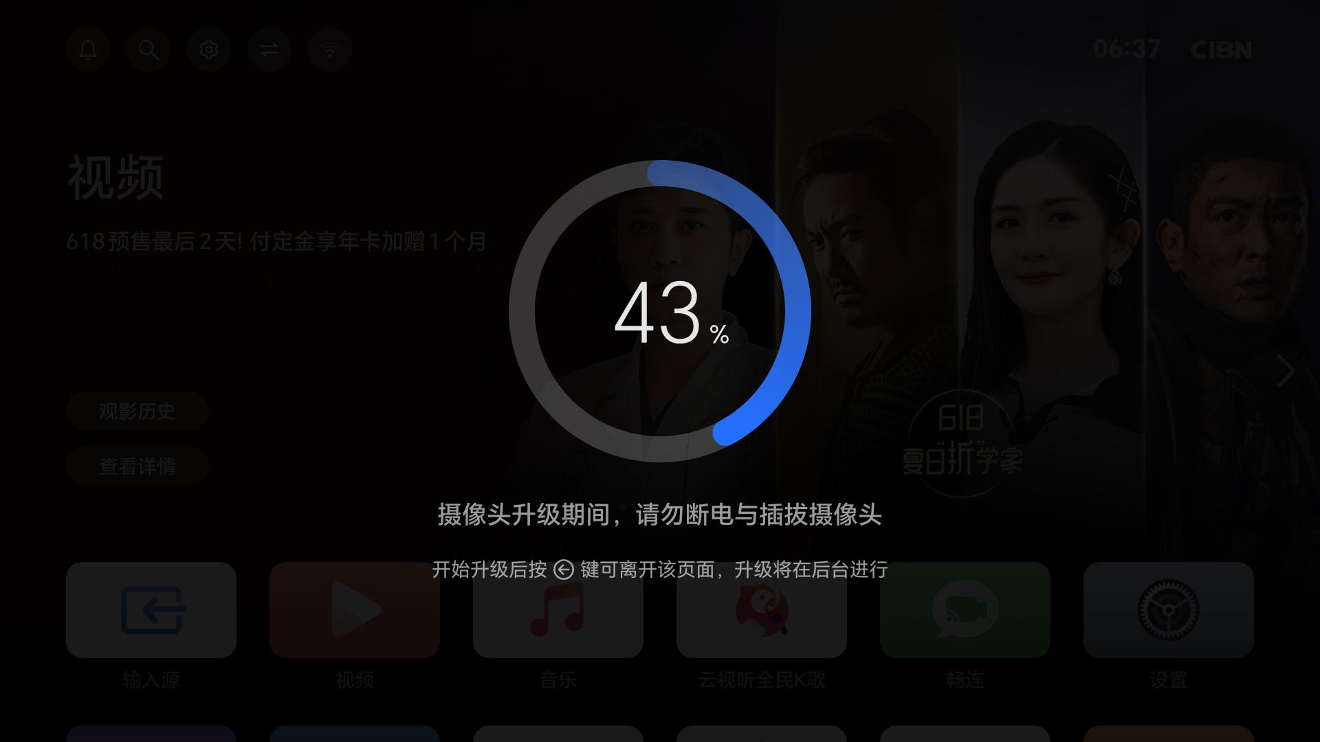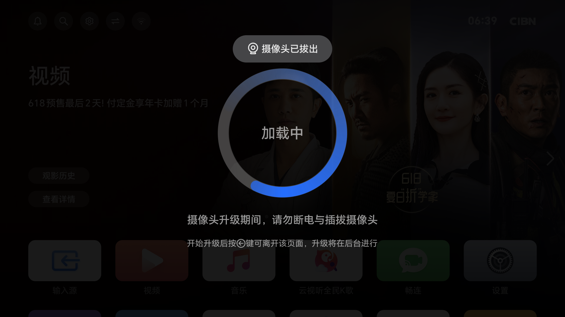 - 此时需重新拔插摄像头(需要摄像头保持连接状态)或者重启智慧屏重新进入升级流程。