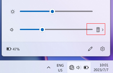 投屏时声音默认从平板设备输出,您可以在PC上选择音频输出设备是从平板设备输出还是从PC输出。选择音频输出按钮在PC桌面右下角音响标志。