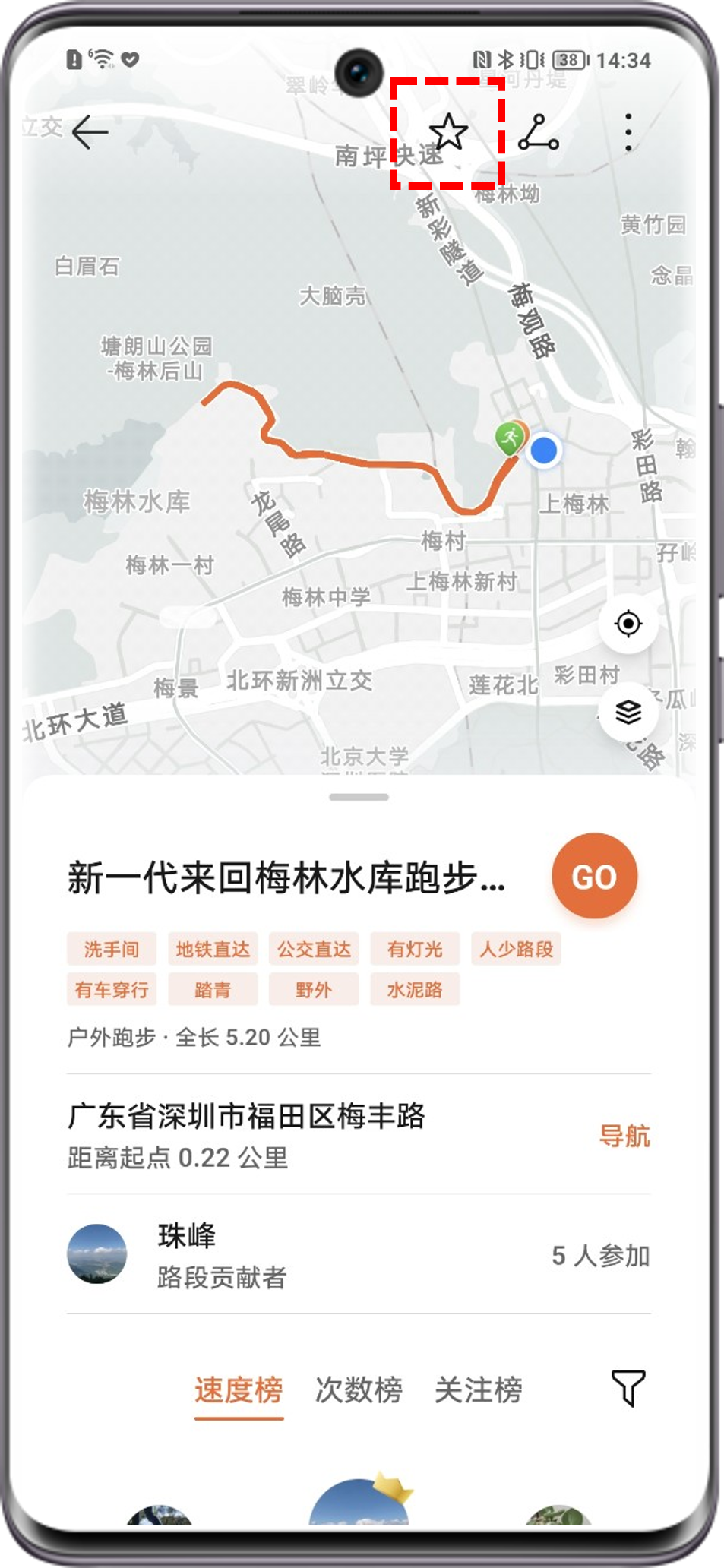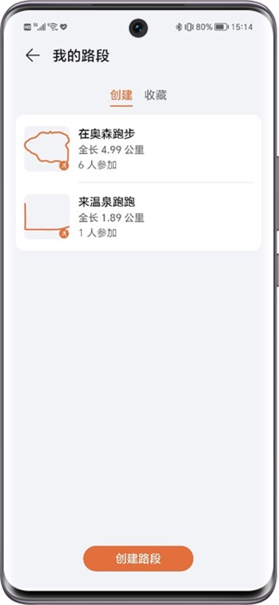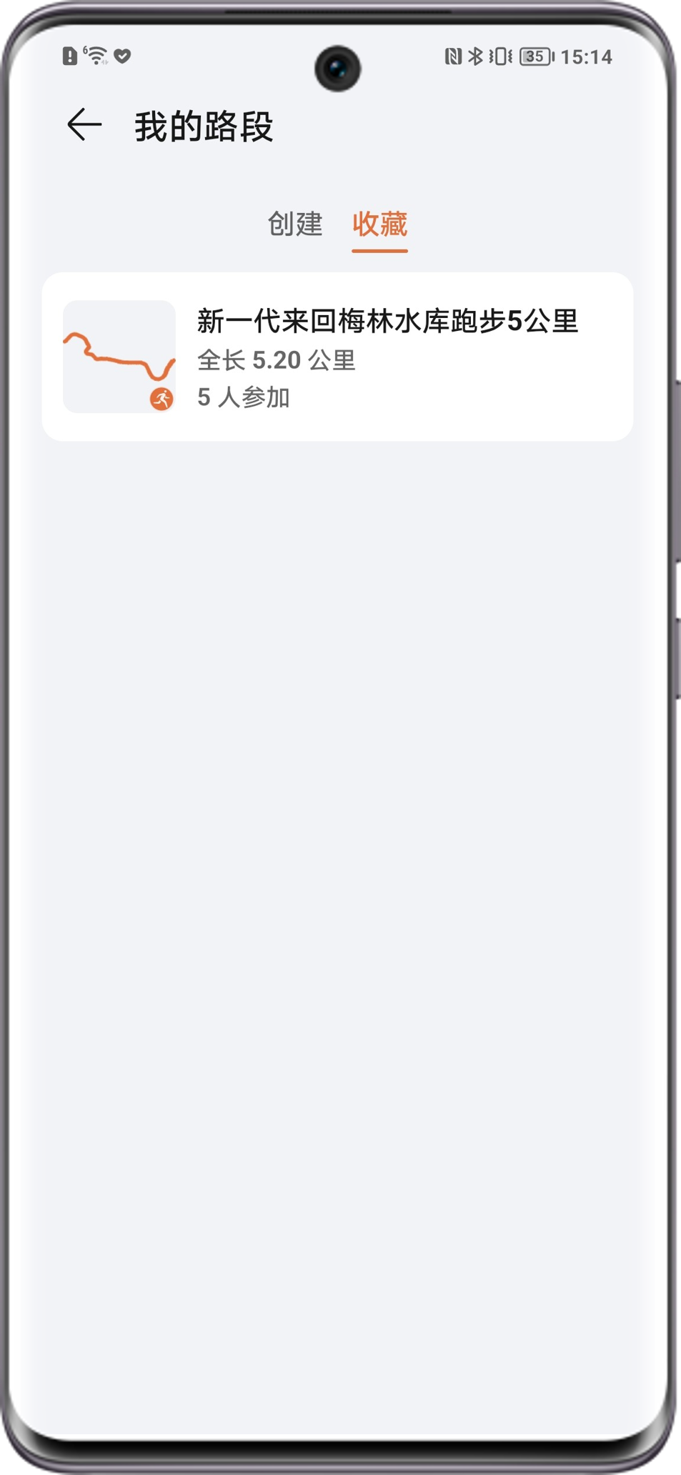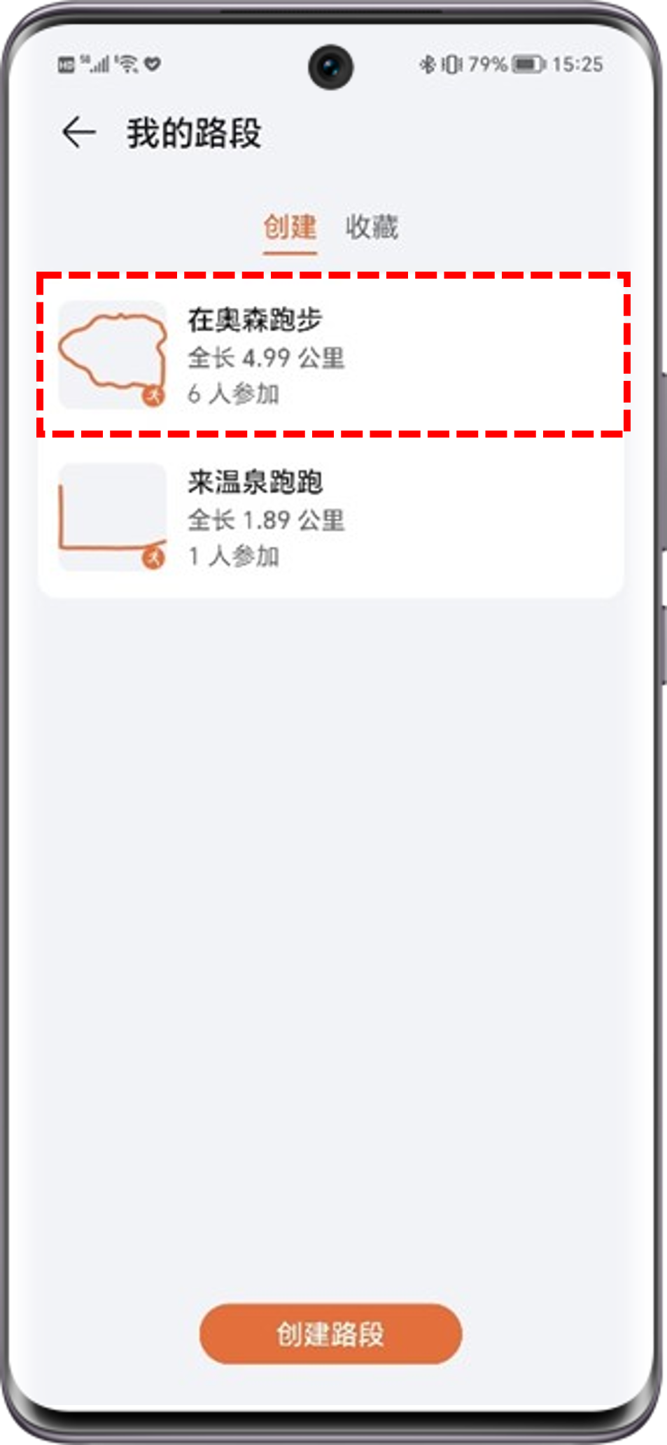 在运动赛场中,选择喜欢的路线后,点击顶部☆可收藏路线。在荣耀运动健康APP>我的>我的路段>收藏可查看相应路段。