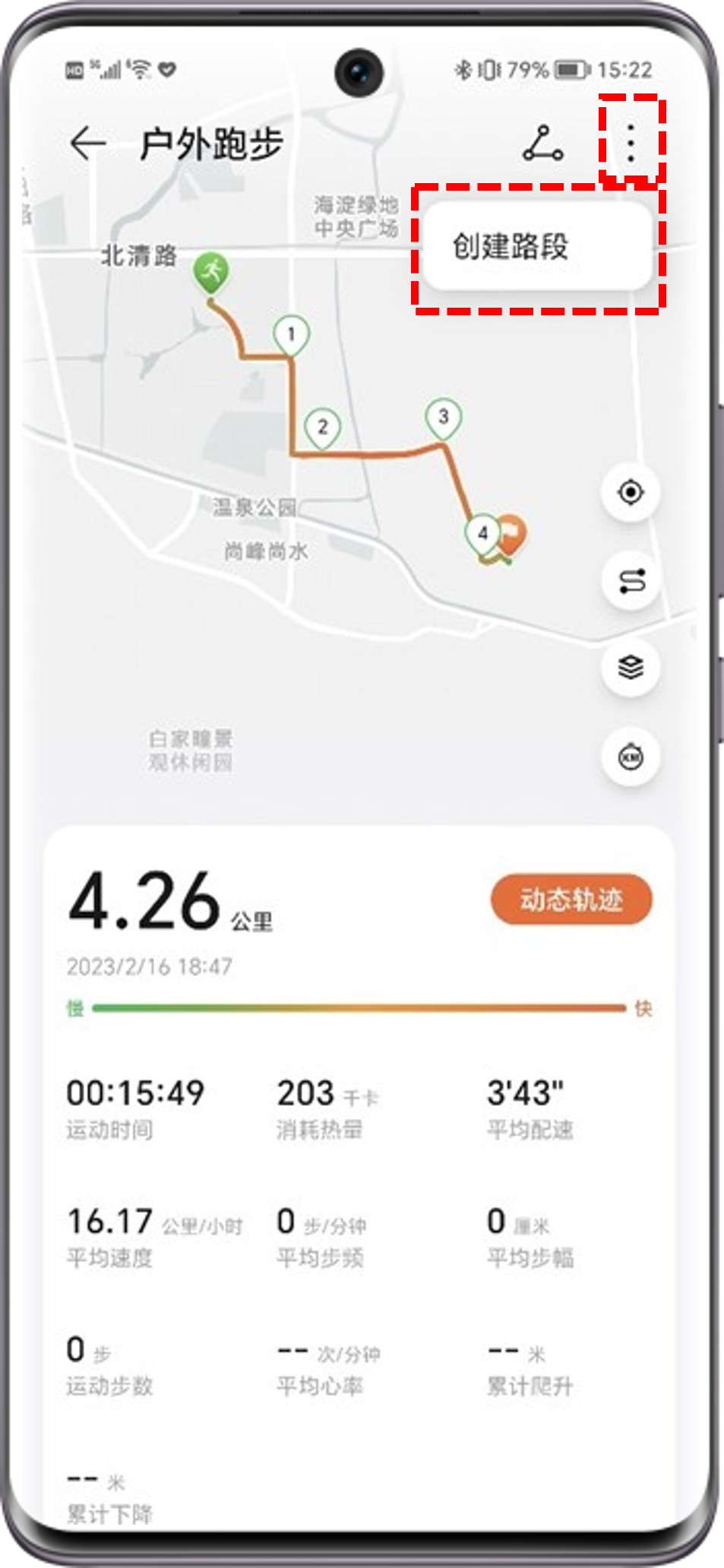 创建路段之前,需要您已使用荣耀运动健康APP进行过户外跑步/骑行/步行。拥有相关运动记录后,您可以通过以下两个方法创建路段: