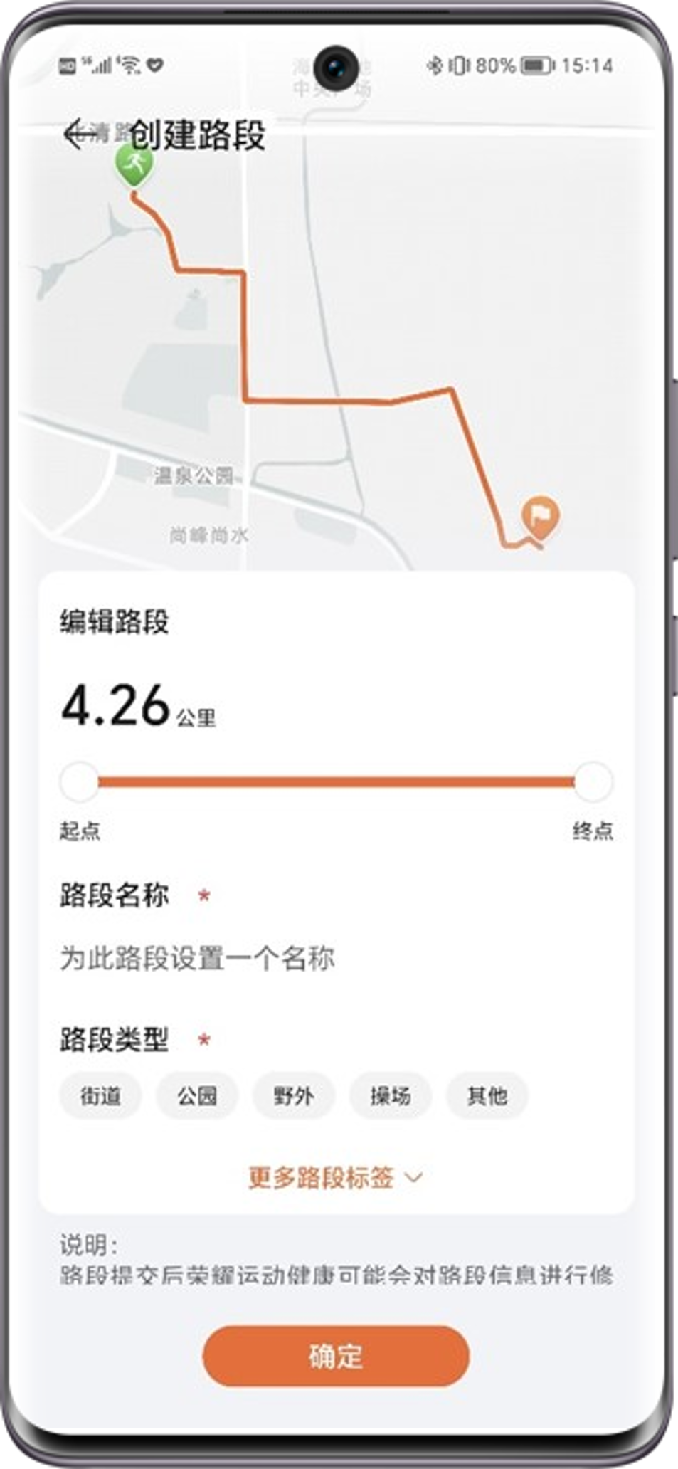 - 荣耀运动健康APP>我的>我的路段>创建路段>选择运动数据>创建路段>输入路段名称,选择路段类型>确定,路段审核通过后将自动发布。