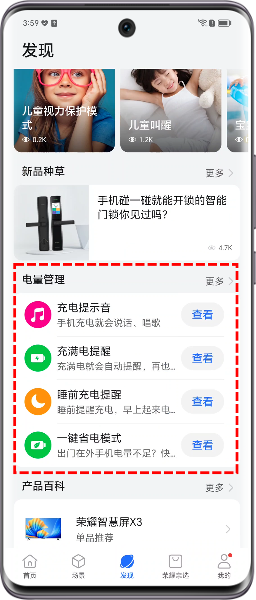 您可以直接使用荣耀智慧空间>发现>电量管理中场景模板,点击查看>添加到我的场景。