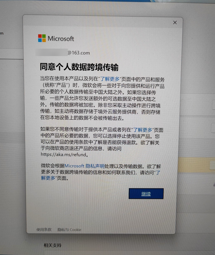 Windows系统更新或激活时弹出“同意个人数据跨境传输”协议。