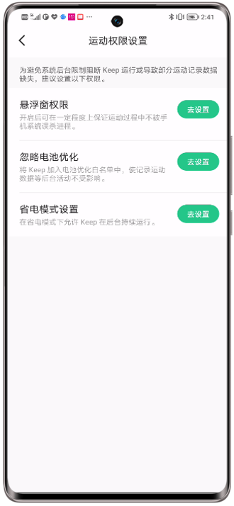 在keep中点击我>左上角>设置>运动设置>运动权限设置,有3个设置项,点击去设置,打开相关权限。