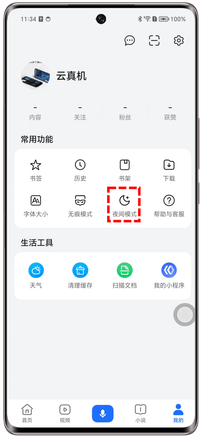 点击浏览器>我的>右上角