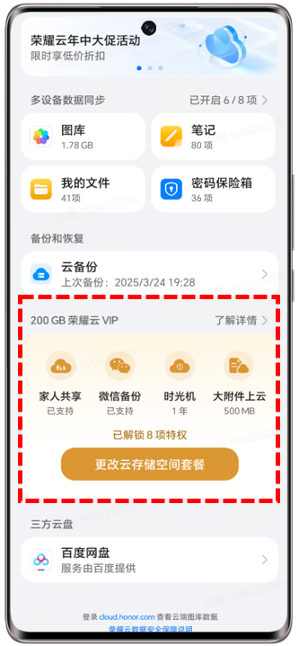 此权益仅部分设备支持,并要求荣耀云升级至10.0.0.300及以上版本,详情可点击荣耀云—每日备份功能的使用条件。