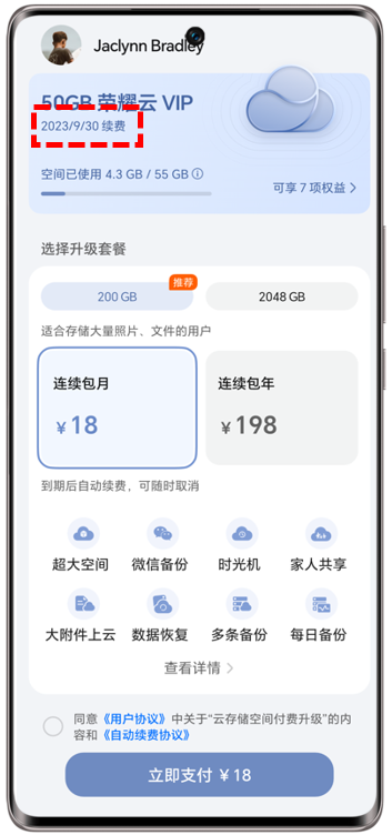 用户可选购50G、200G、2048GB三种空间大小的荣耀云VIP套餐。