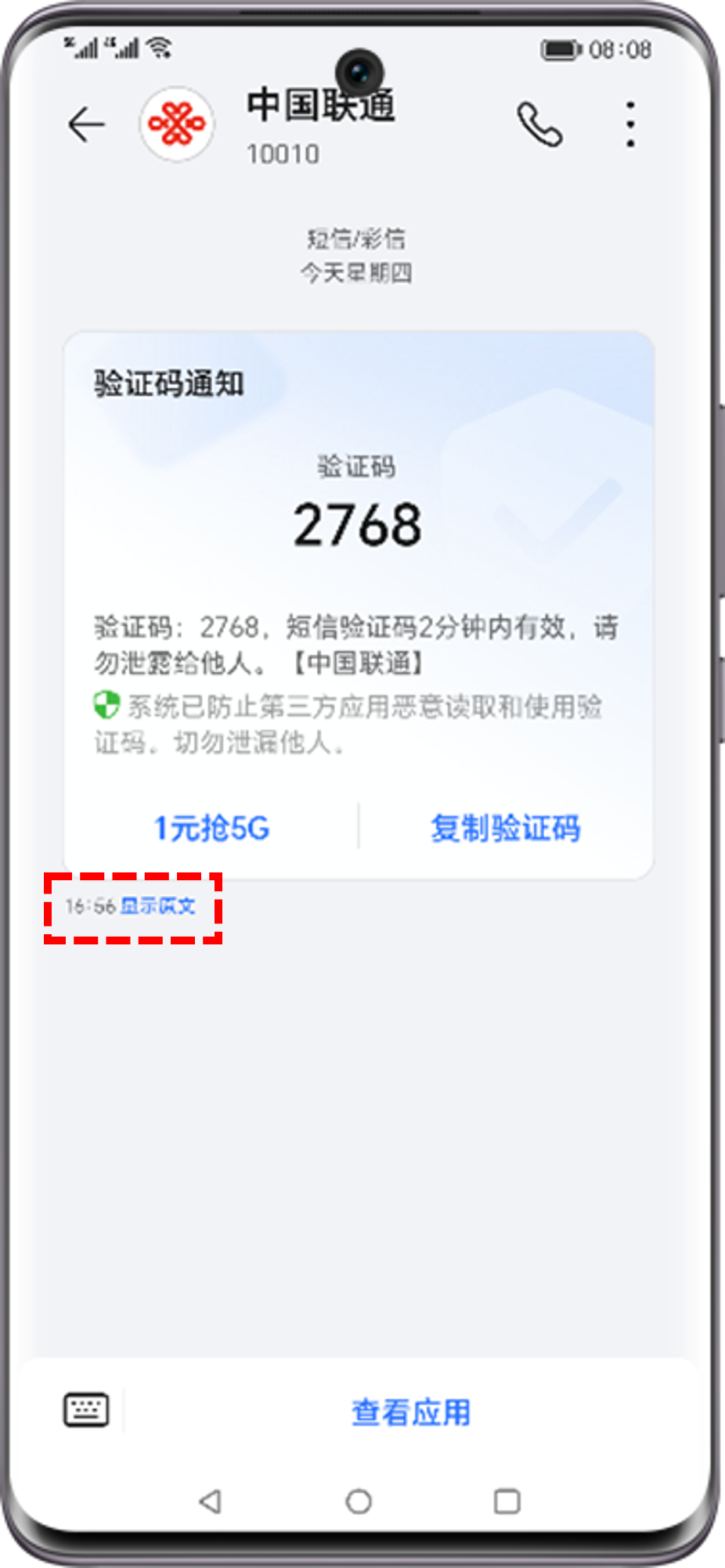 点击卡片下方显示原文即可显示短信原文.