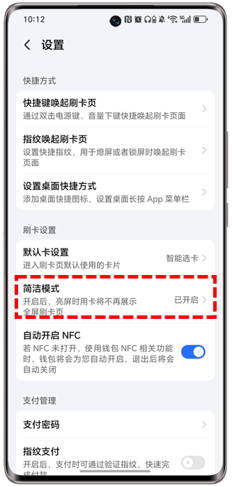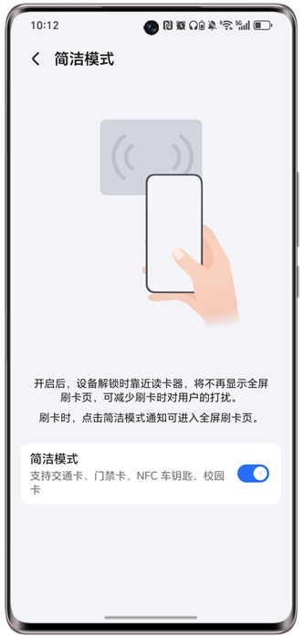 荣耀钱包中的交通卡、门禁卡、银行卡、校园卡、车钥匙刷卡支持简洁模式,简洁模式开启后,在设备解锁时刷卡将不再展示全屏刷卡页,仅以消息通知形式(或灵动胶囊)展示,点击通知消息(灵动胶囊)可进入全屏刷卡页。