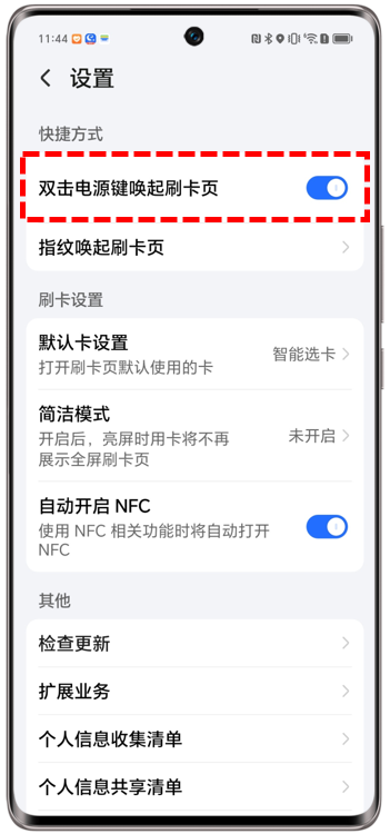 双击音量下键唤起刷卡页设置方法:系统设置>辅助功能>快捷启动及手势>熄屏下双击音量下键>勾选唤起刷卡页。