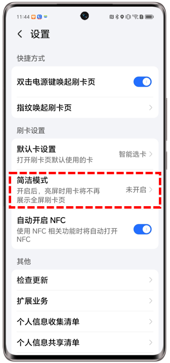 荣耀钱包中的交通卡、门禁卡刷卡支持简洁模式,简洁模式开启后,在设备解锁时刷卡将不再展示全屏刷卡页,仅以消息通知形式展示,点击通知消息可进入全屏刷卡页。