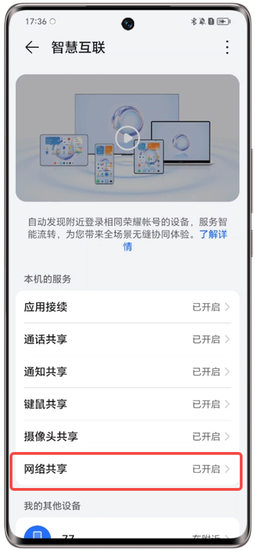 智慧互联开启后,手机上无法找到网络共享跨设备操作开关
