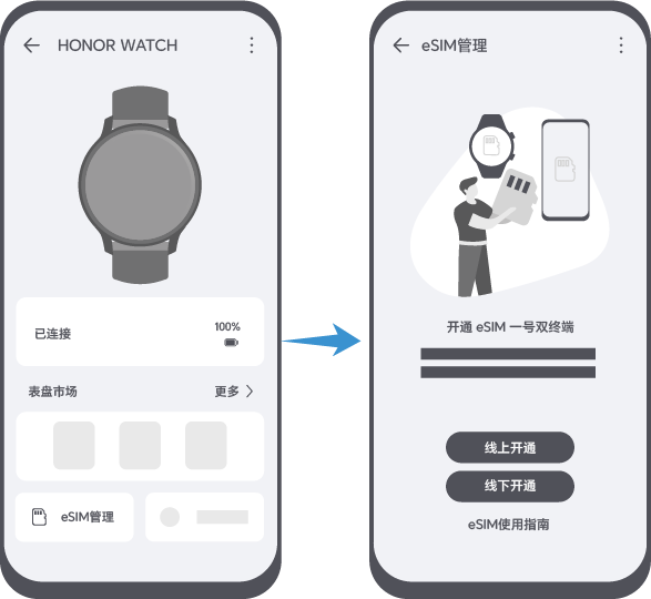打开荣耀运动健康 App,进入设备详情页。点击eSIM 管理,界面显示已开通 eSIM 业务即办理成功。