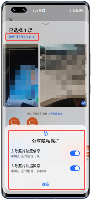荣耀分享界面,点击上方隐私保护已开启,关闭去除照片位置信息和去除照片拍着数据开关。