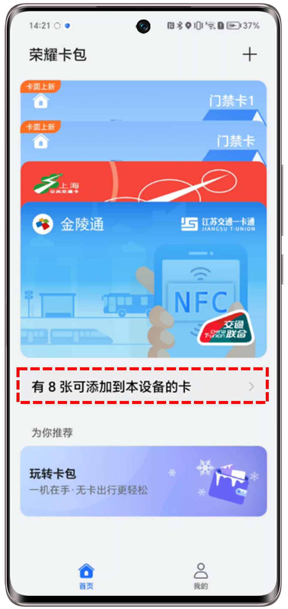 交通卡迁卡需旧设备配合操作,若旧设备无法配合操作迁卡,您可进入荣耀钱包>我的>右上角