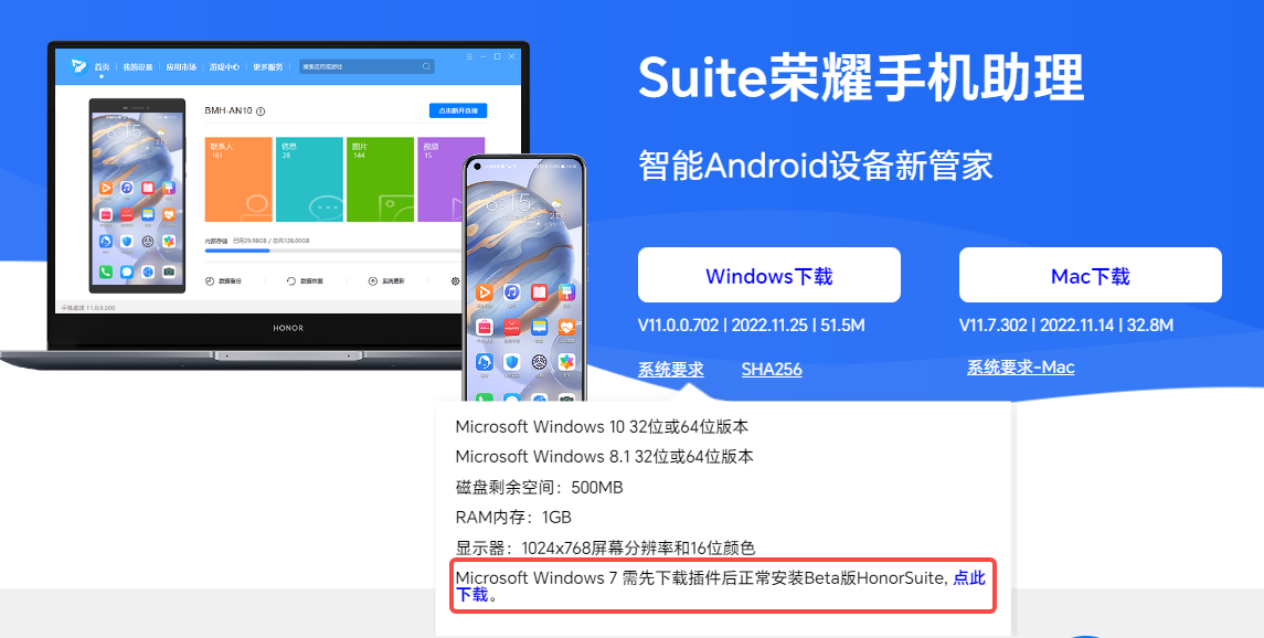 - 进入下载页面https://www.honor.com/cn/tech/honor-suite/;