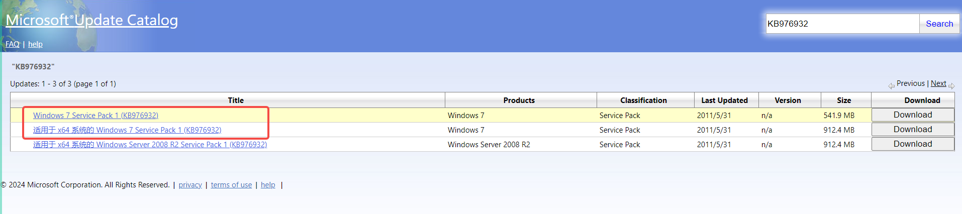 - 如果您的windows 7系统版本未更新到Service Pack 1版本,请在如下微软官网下载对应的更新补丁(https://www.catalog.update.microsoft.com/Search.aspx?q=KB976932)。