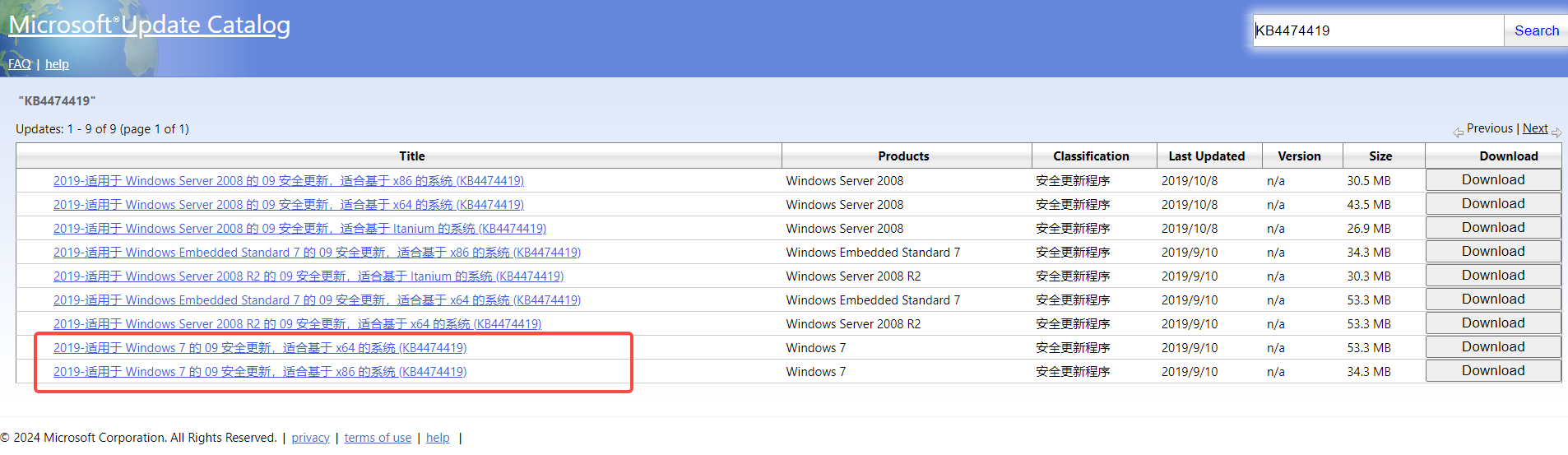 - 确保您的windows 7系统已更新到Service Pack 1版本,然后继续在微软官网下载对应的更新补丁(https://www.catalog.update.microsoft.com/Search.aspx?q=KB4474419)。