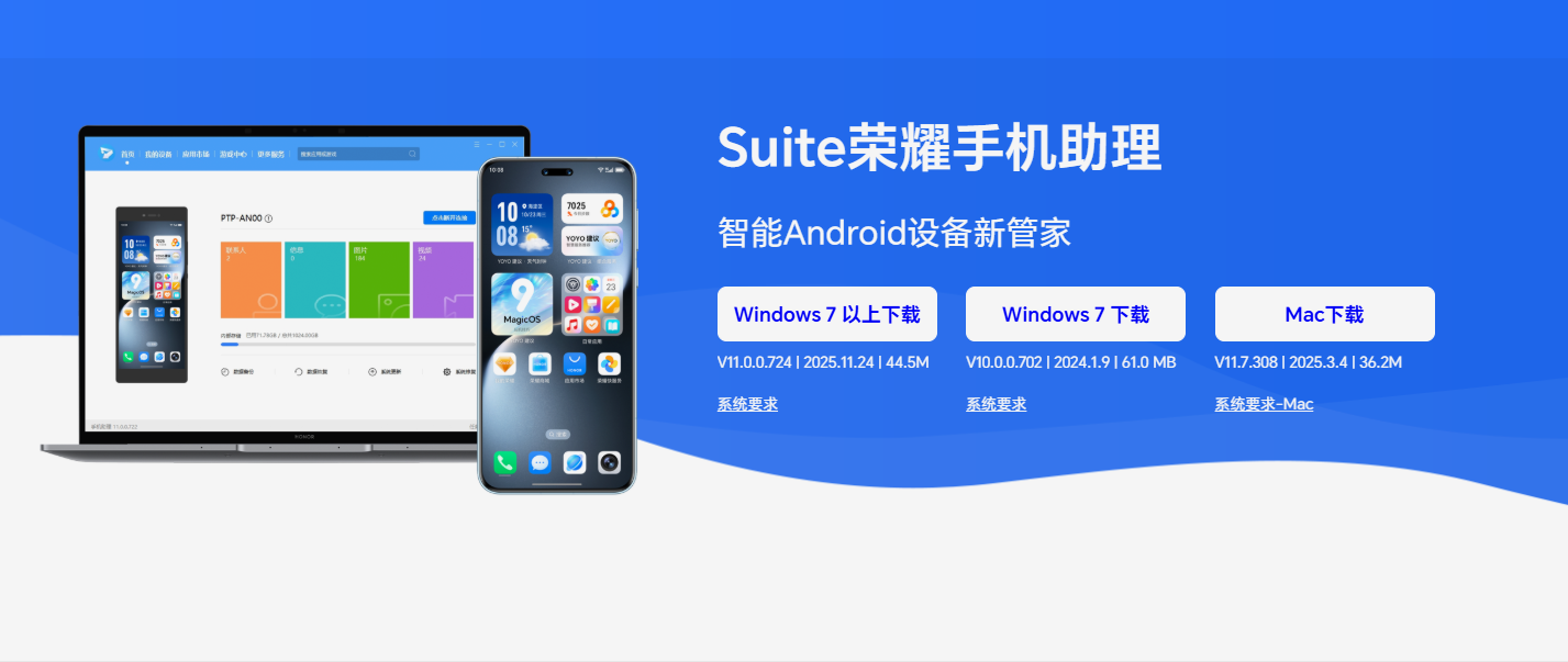 进入下载页面https://www.honor.com/cn/tech/honor-suite/,点击Windows7 下载,安装后可以正常使用手机助理的所有功能。