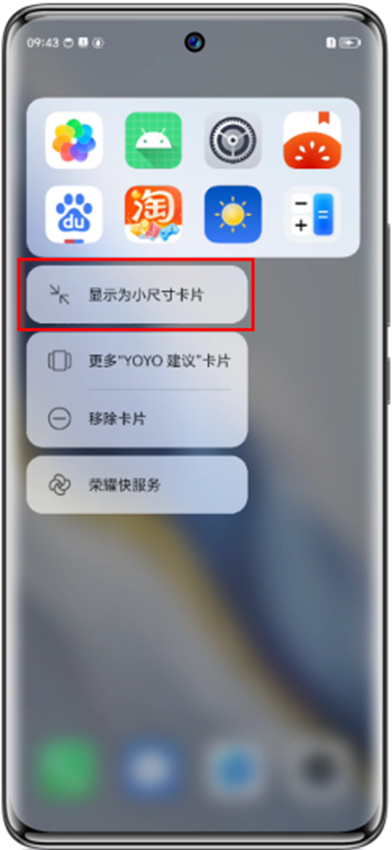 方法2:设置>荣耀AI & YOYO/智慧助手>YOYO建议>添加”YOYO建议“到桌面(按住卡片,可选择“显示小尺寸卡片”移动到手机主桌面)。