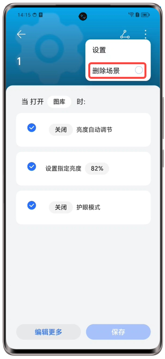 打开智慧空间APP,选择“场景”,找到对应的场景点击进入,点击右上角展开菜单并点击“删除场景”。