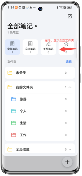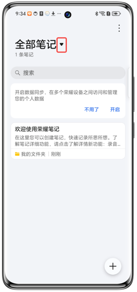MagicOS 8.X:进入笔记主页 小三角按钮,滑动文件夹区域,查看各个文件夹下是否有笔记。