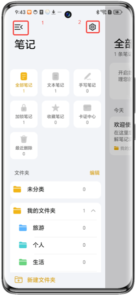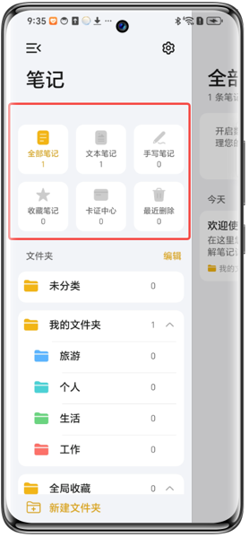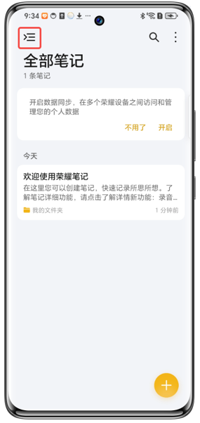 MagicOS 9.0:进入笔记主页,点击左上角抽屉按钮,查看各文件夹下是否有数据。