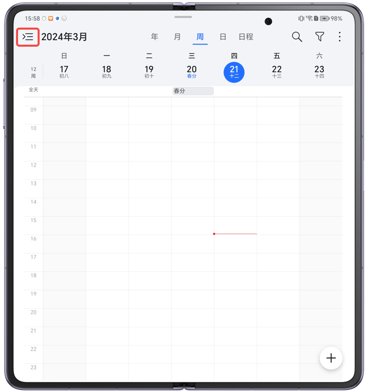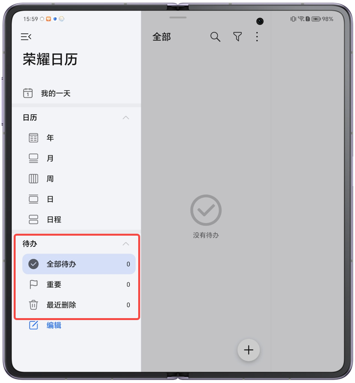 折叠屏手机大屏状态:待办入口在日历设置中(日历左上角