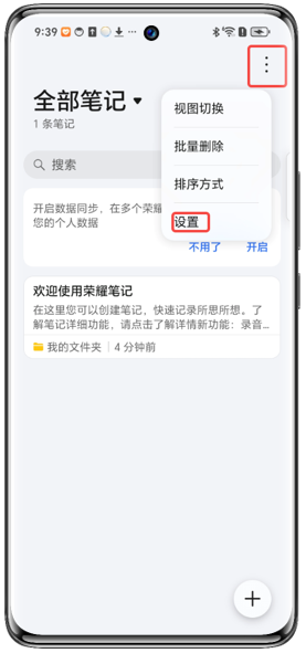 操作步骤:笔记>右上角三个点>设置>笔记数据云同步>点击> “笔记”开关打开。如未登录账号,需先登录荣耀账号。