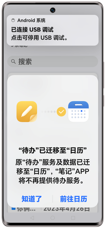 首次打开笔记时,会有弹窗提醒“待办已迁移至日历”。后续可进入日历应用,查看待办事项。