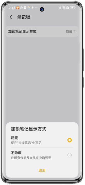 加锁笔记当前显示规则:如果是“隐藏”则在“全部笔记”列表中不展示;“不隐藏”时在“全部笔记”列表中才展示,并计数。