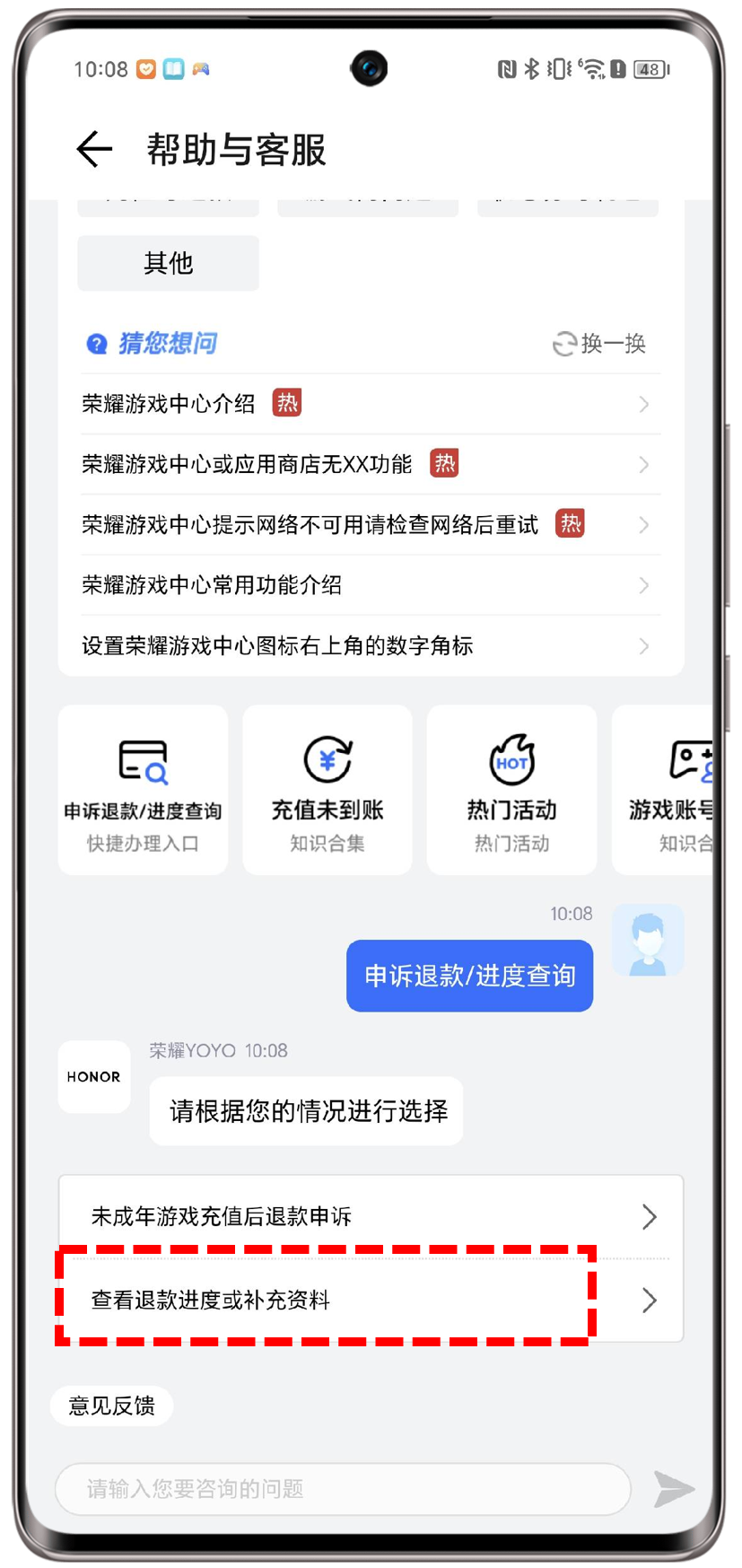 如资料审核不通过、显示驳回,请修改补充材料:荣耀游戏中心App>我的>帮助与客服>申诉退款/进度查询>查看退款进度或补充资料。