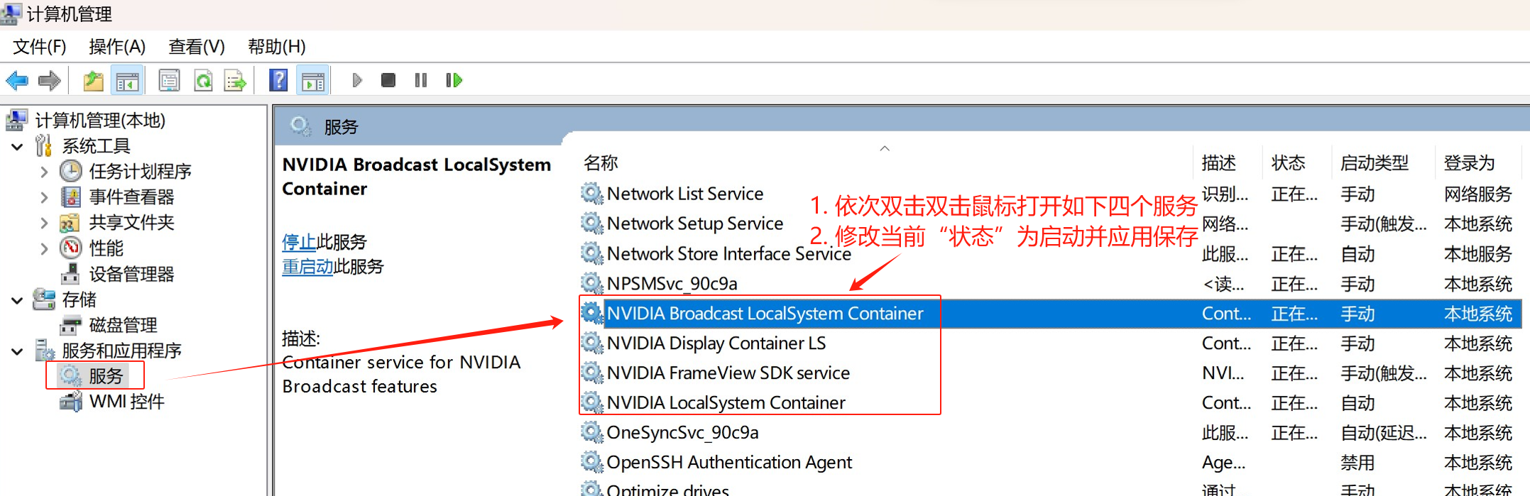 - 如上图,找到4个NVIDIA相关的服务使用鼠标右键双击依次打开,确认状态是否“正在运行”,若不是,请点击“启动”,然后“确定”保存。