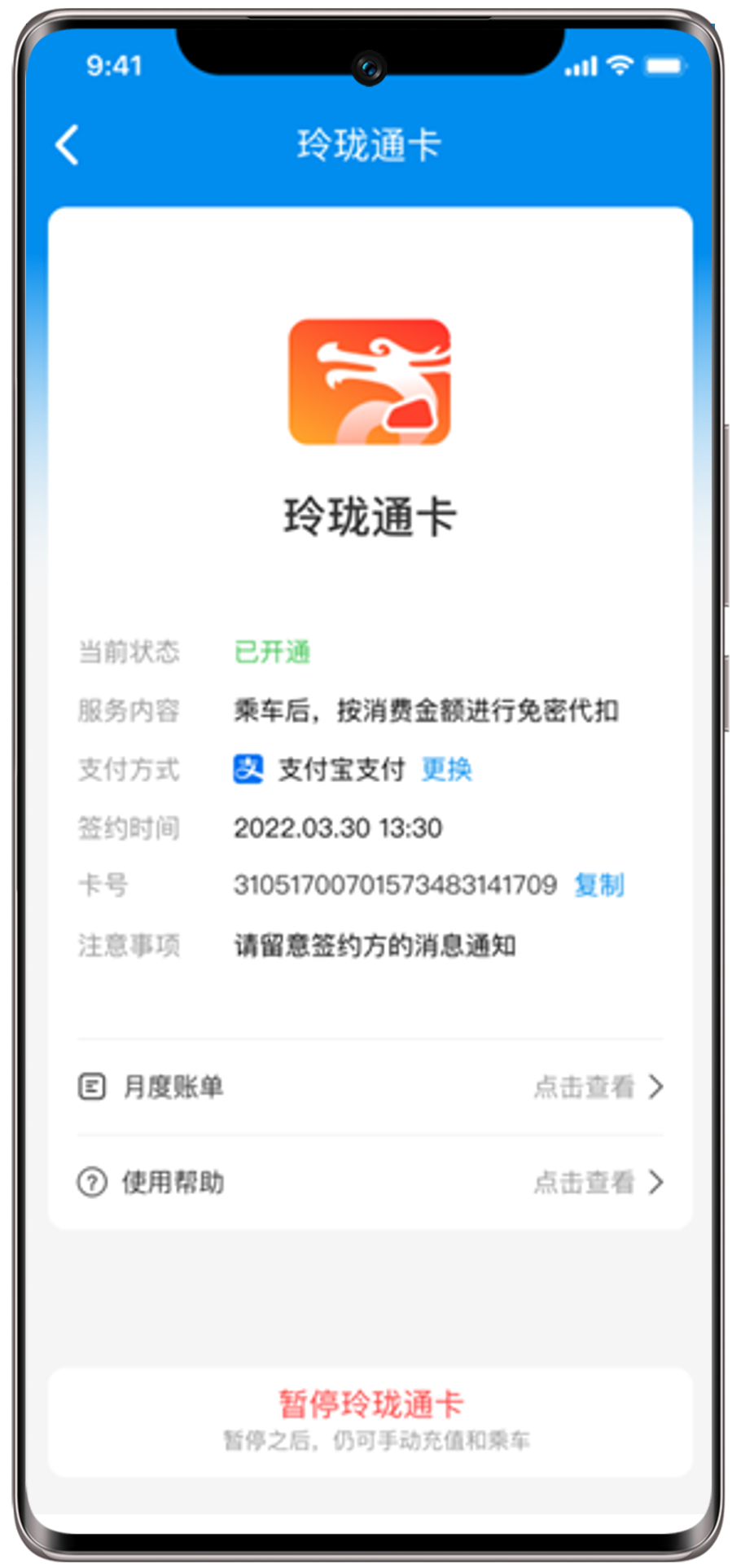 温馨提示:暂停玲珑通卡后公交卡将恢复原状,仍可手动充值及刷卡使用,再次开通时免密代扣阈值以再次开通时卡内余额为准(不足10元的,自动补充至10元,阈值设置为10元)。