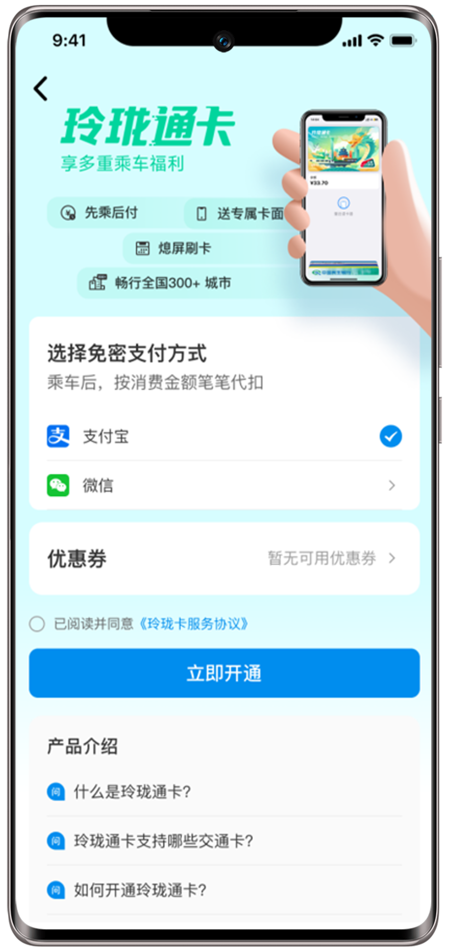 北京一卡通“玲珑通卡”产品是基于NFC技术的类二维码产品,开通玲珑通卡时需要签约免密支付渠道,在刷卡乘车后自动免密代扣、实现先乘后付。