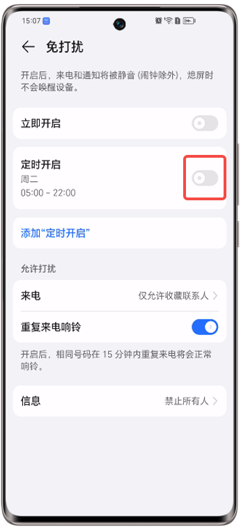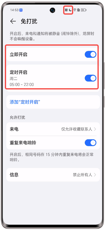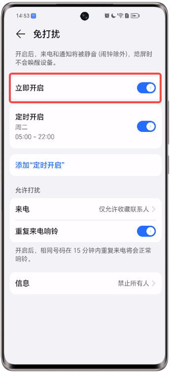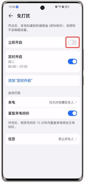 定时免打扰生效时,关闭立即开启开关,免打扰功能失效,来电和通知未被静音。