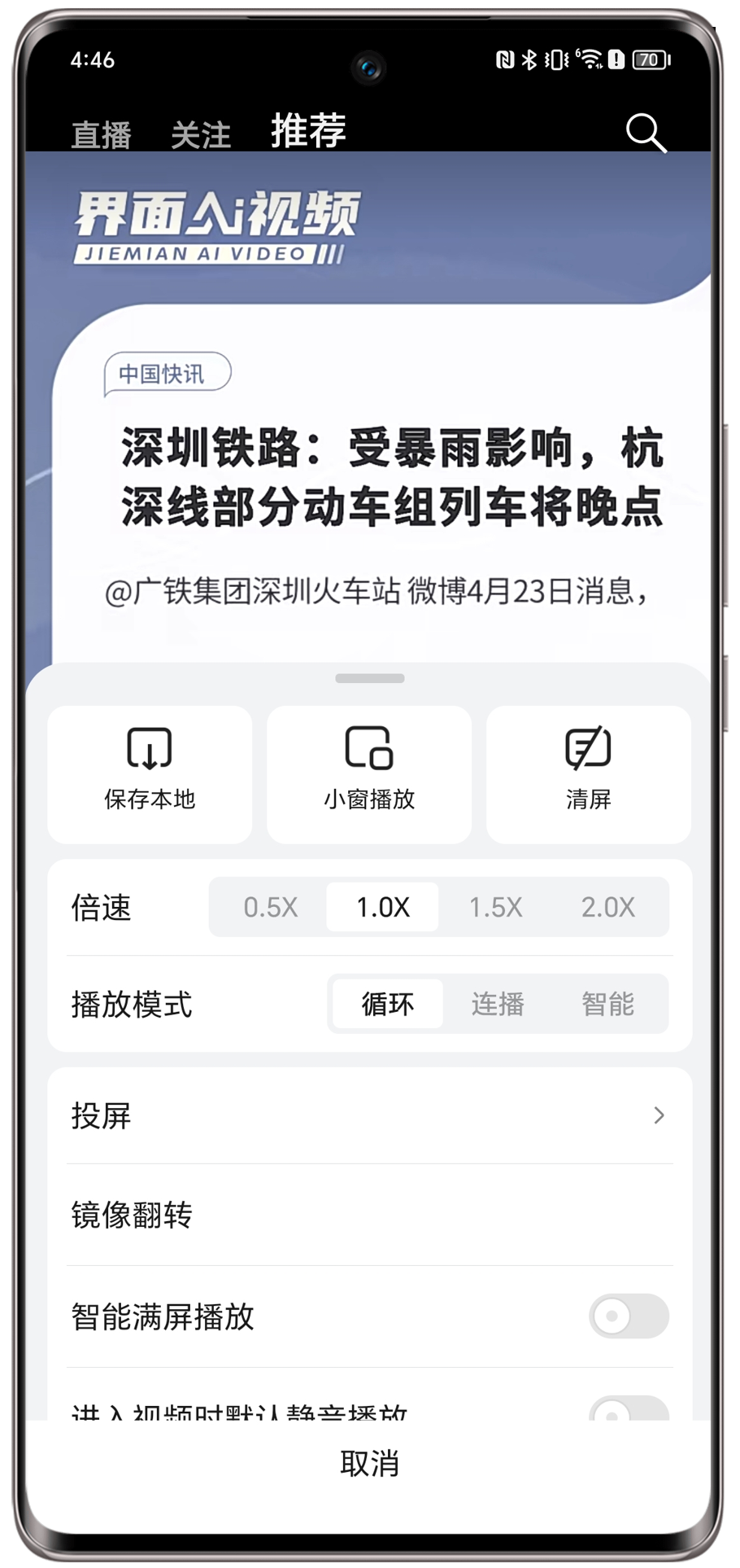 - 在浏览器>视频>长按视频画面中央拉起操作页>倍速中选择视频播放速度,支持0.5X、1.0X、1.5X、2.0X倍速。